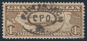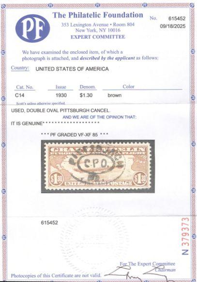 4149 C14 imageC14, $1.30 Zeppelin, beautifully centered, rich colour, neat SON oval Pittsburgh PA / CPO cancel. VF/XF, all perfs present (LR perfs covered by cancel ink). Has 2025 Philatelic Foundation Certificate graded 85 (Image) (View Certificate)