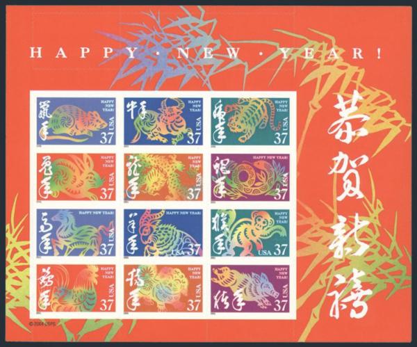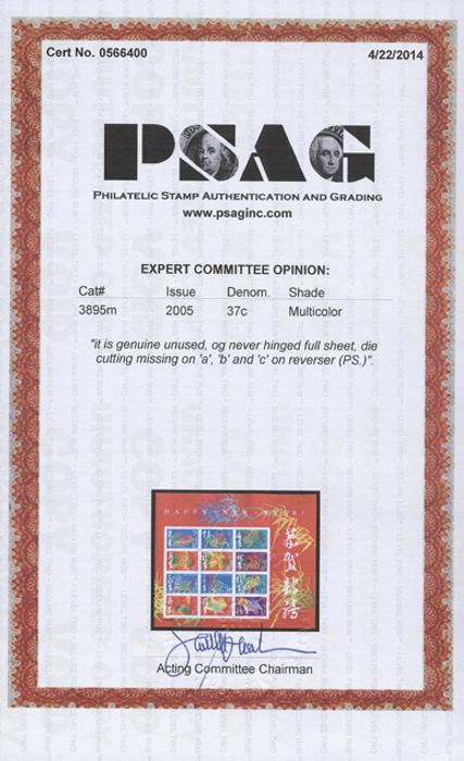 4136 3895m image3895m, Complete se-tenant Lunar New Year sheet of 24 (printed on both sides). Has DIE CUTTING MISSING on "a", "b" and "c" on reverse side. Fresh, VF, NH. Has 2014 PSAG Certificate. A RARE ITEM! (Image) (View Certificate)