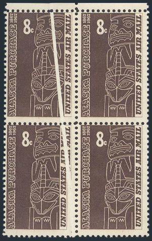 4154 C70 imageC70, Margin block of the 8¢ Alaska Purchase Airmail with a major PRE-PRINTING PAPER FOLD variety affecting 3 stamps. VF, NH (Image) Estimate 100.00+ $Cdn