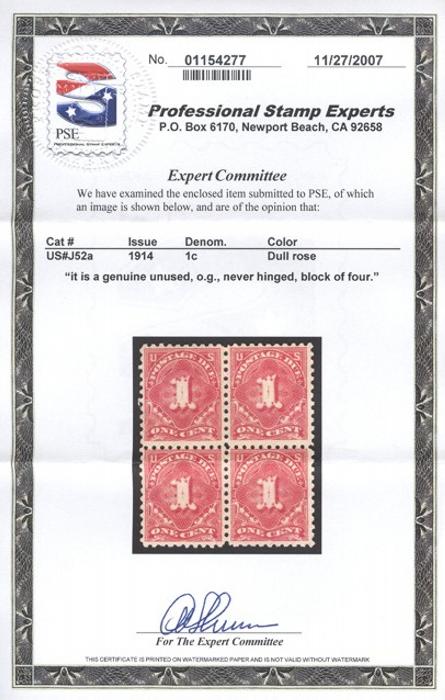 4163 J52a imageJ52a, Scarce Postage Due block. F+, NH. Has 2007 PSE Certificate (Image) (View Certificate)