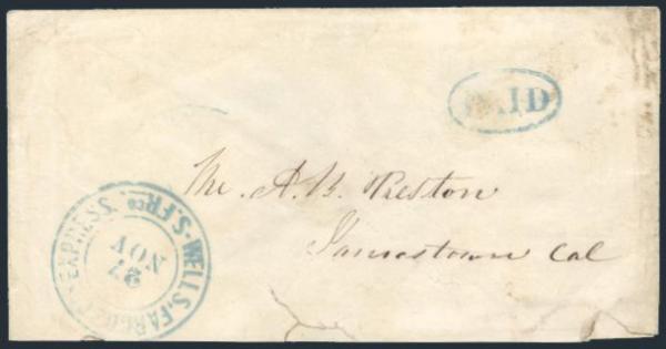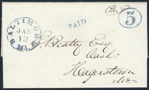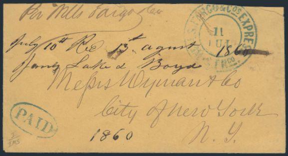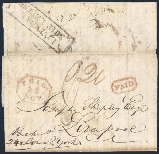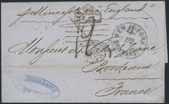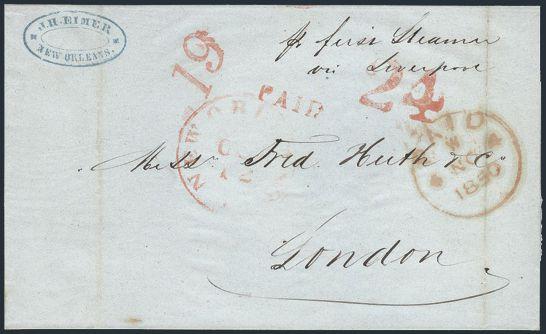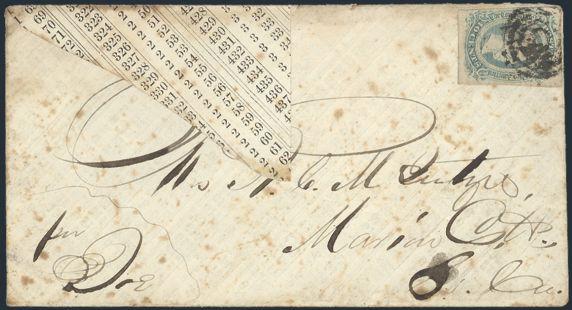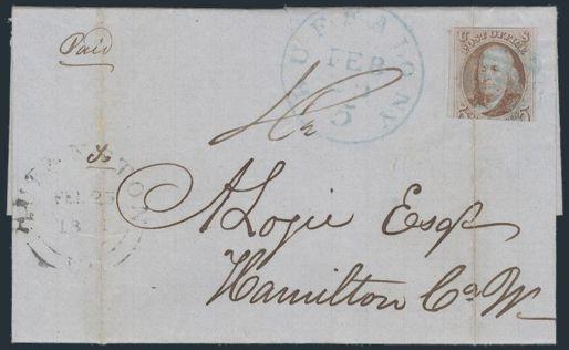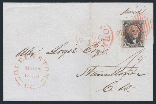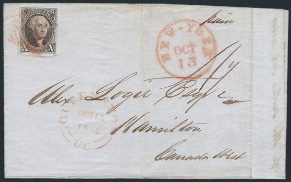 attractive VF four margin single neatly tied by red grid cancels on folded cross-border cover, sent from New York 12 Aug 1848 and addr to Hamilton, Canada West (Aug 16 b/s). Has red Queenston 15 Aug exchange office cancel. VF, file fold not affecting