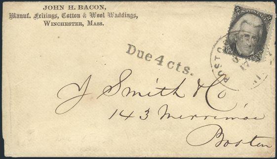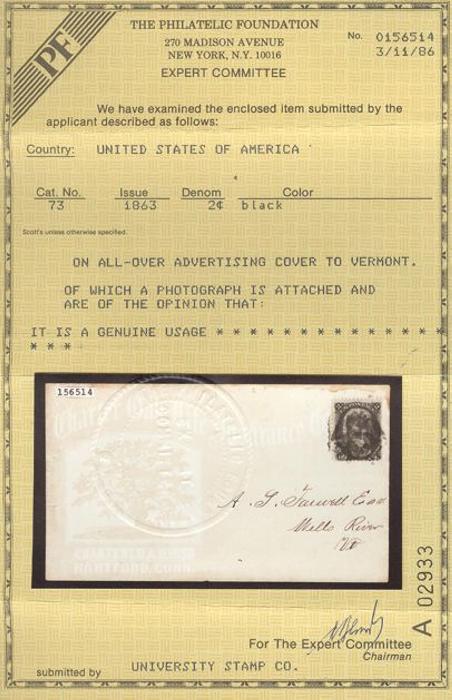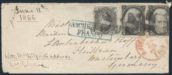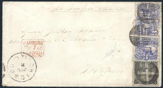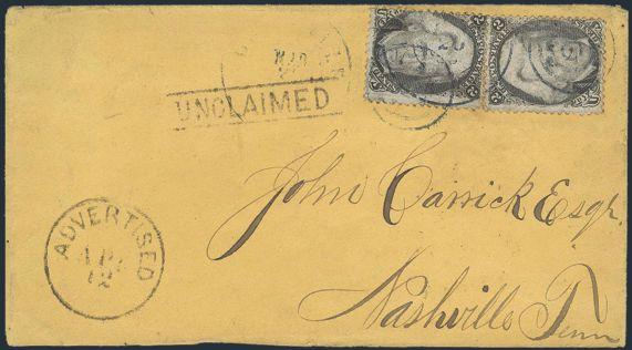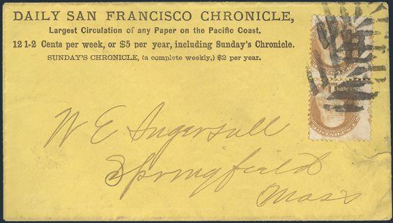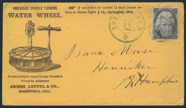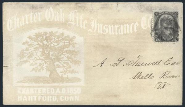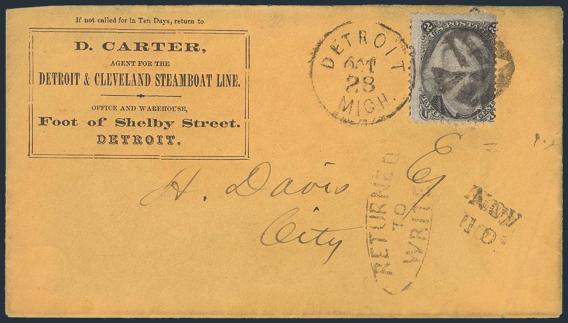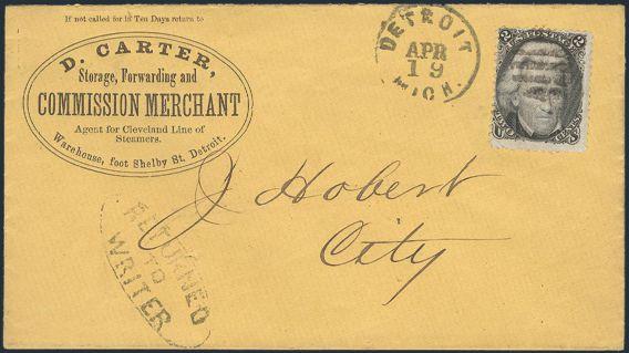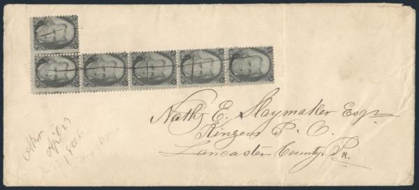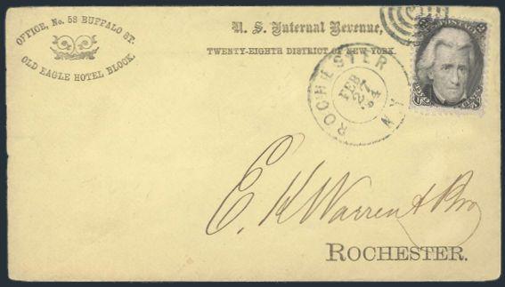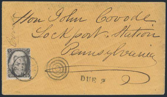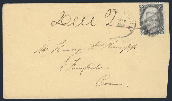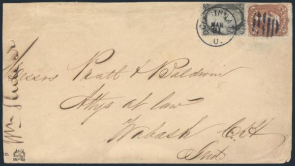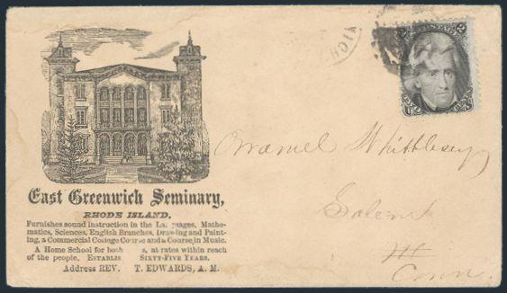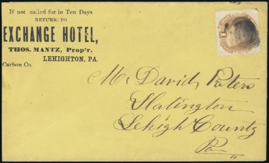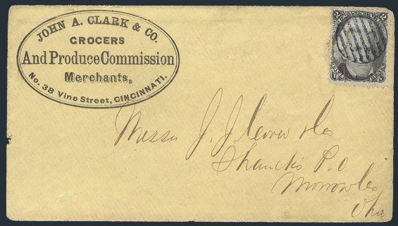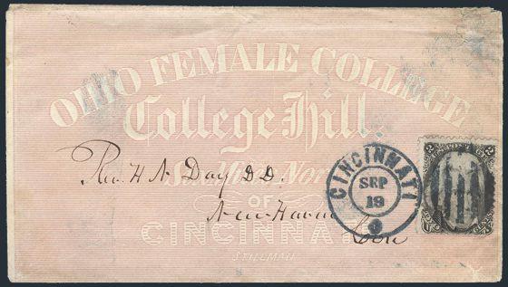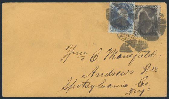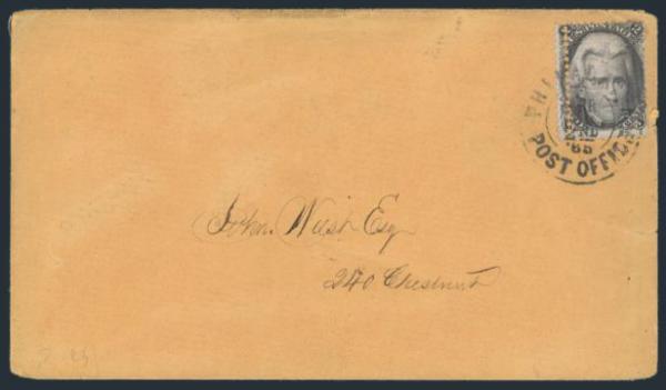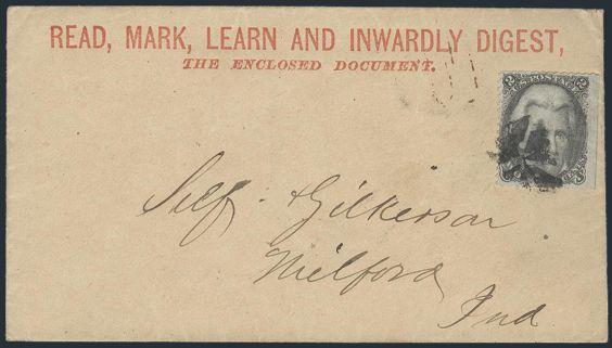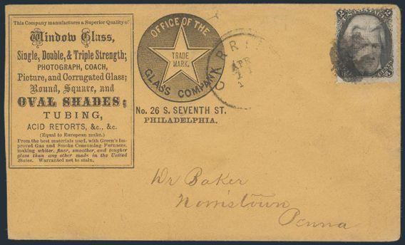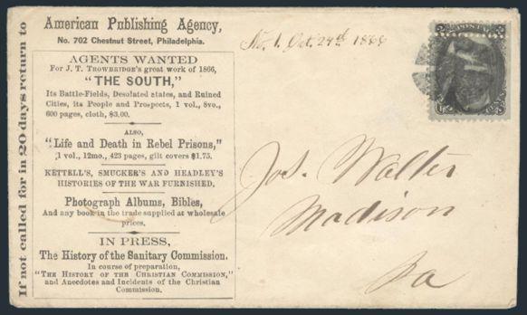 HORIZONTAL PERFS AT TOP, Tied by neat cork cancel on advertising cover for American Publishing Agency, Philadelphia to Madison, Pa. Dated 24 Oct 1866. Has corner card with details on Civil War Titles incl "The South", "Life & Death in Rebel Prisons",