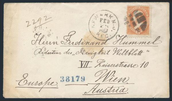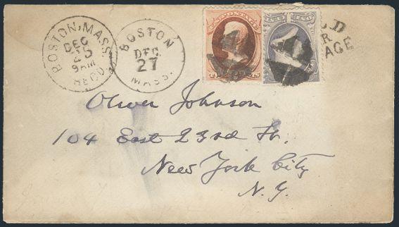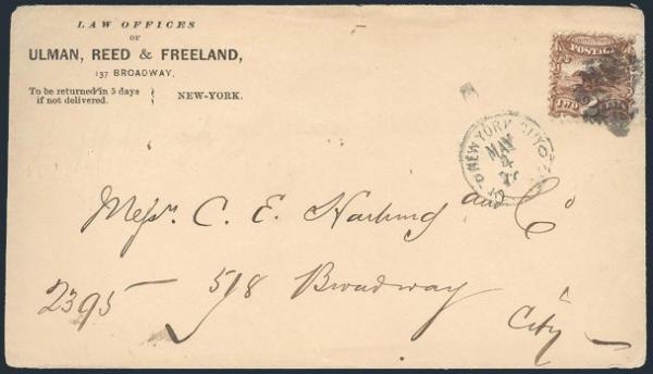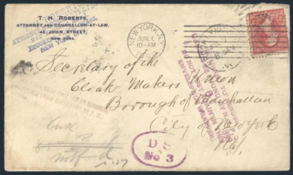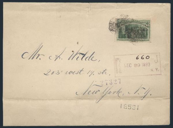 Dollar Columbian tied by indistinct registry cancels on locally addressed cover with clear New York 29 Dec 1893 purple registry marking (Brooklyn arrival on reverse). F-VF, slightly reduced at left, small cover tear at top and horizontal crease at