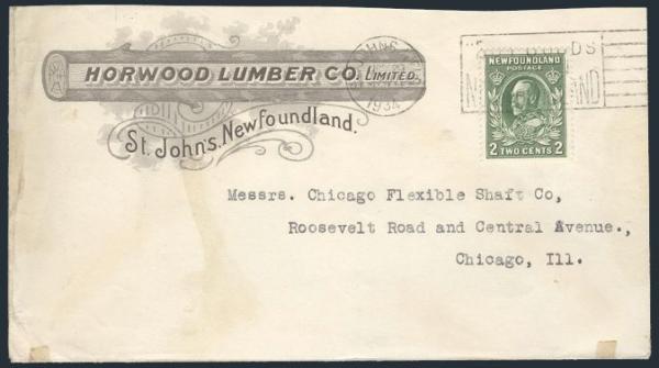 4725 186 image186, Tied by St John's 1934 slogan cancel on pretty illustrated advertising cover for Horwood Lumber Co. in St. John's. Addr to Chicago. F (Image) Estimate 75.00+ $Cdn