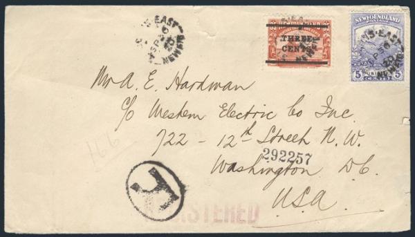 4703 119, 129 image119, 129, Tied by St. John's 30 Sept, 1920 split-ring cancels on Reg'd cover to Washington DC (rec b/s). Scarce franking, F, edge tear (Image) Estimate 100.00+ $Cdn