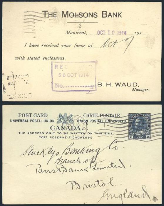 5054 P81 imageP81, Blue 2¢ Admiral UPU Postal Stationery card with printed message on the reverse used from THE MOLSONS BANK in Montreal 19 Oct, 1914. Addr to the Paris Bank Ltd. in Bristol England. VF. Cat $250 (Image) Estimate 125.00+ $Cdn