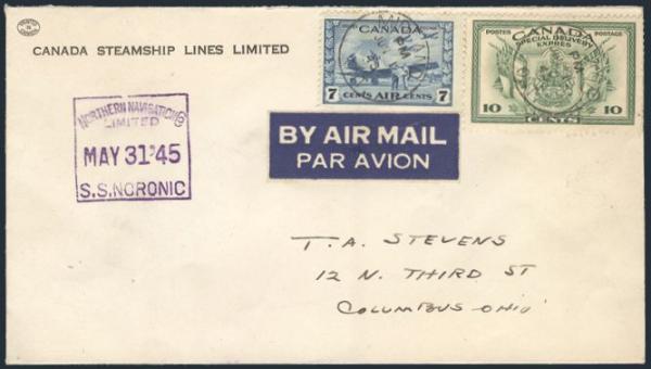 5060 C8, E10 imageC8, E10, Tied by Midland Ont 1 June 1945 CDS's on Airmail Express cover to USA. Has Canada Steamship Lines Ltd. corner card & scarce "NORTHERN NAVIGATION Co. / Ltd. / S.S. NORONIC / 31 May 1945" violet boxed ship cancel The Noronic burned in Toronto harbour 14 Sept 1949 with 118 fatalities. VF (Image) Estimate 125.00+ $Cdn