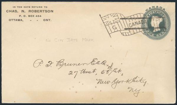 5052 EN11 imageEN11, QV 1¢ green postal stat envelope with FLAG 'G' CANCEL WITHOUT CITY AND DATE MARKING. Has Ottawa corner card. Addr to New York. F, light toning (Image) Estimate 175.00+ $Cdn