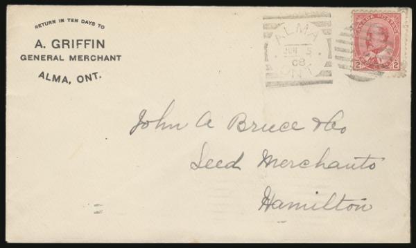 5068   imageALMA ONT (State 2, RF 35), Nice fully dated strike 5 Jun '08 (with unrecorded 3-letter month in 1908) on #90 cover to Hamilton Ont. Has nice advertising corner card for a General Merchant in Alma. VF (Image) Estimate 100.00+ $Cdn