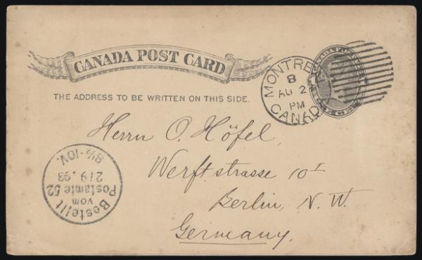 5057 UX13 imageUX13, With Montreal 22 Aug (1893) duplex cancel on QV 1¢ postal stationery card to Berlin, Germany with 21 Sept receiver. Extra 1¢ adhesive should have been affixed - UNDERPAID. No charge made on delivery. F, toned (Image) Estimate 40.00+ $Cdn