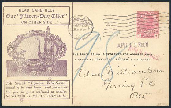 5053 P44 imageP44, Illustrated advertising card for Consolidated Premium Co. with Montreal 28 Mar 1911 cancel to Goring, Ont (split-ring b/s). Depicts silver service in violet. F, small edge flaw (Image) Estimate 50.00+ $Cdn