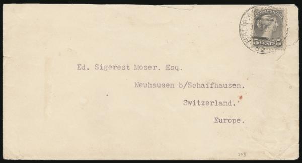 5073   imageHALIFAX NS Precursor (RF20), Nice strike 30 Jan 1892 tying 5¢ Small Queen on Trans-Atlantic cover to Neuhausen Switzerland (rec b/s). From early Canadian stamp dealer HENRY HECHLER with his h/s on reverse. F, couple small edge tears in cover (Image) Estimate 75.00+ $Cdn