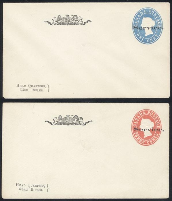 5051 EN3-4 imageEN3-4, Unused QV envelopes overprinted SERVICE along with Coat of Arms and HEAD QUARTERS 63rd RIFLES. These were produced by Henry Heckler. VF (2 diff) (Image) Estimate 125.00+ $Cdn