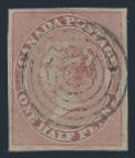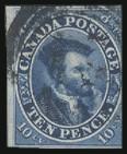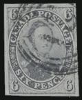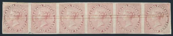 used horiz strip of 6, cancelled by two neat pen lines, full margins all around, VF, one tiny tear at top of left stamp, faint corner crease. MULTIPLES OF PENCE ISSUES LIKE THIS ARE EXCEEDINGLY RARE. Cat $6,000 (Image)