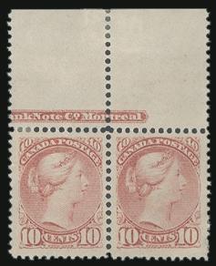 5337 45a image45a, Top margin pair of the 10¢ Dull Rose Carmine with a large portion of the PLATE IMPRINT. Fresh, VF, OG. Has 2006 Greene Foundation Certificate. A VERY PRETTY SHOWPIECE (Image) (View Certificate)