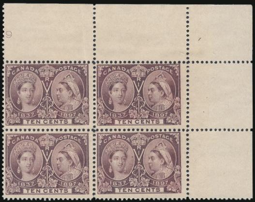 5370 57i image57i, Corner block of the 10¢ Jubilee with the UR stamp (pos 5) having the MAJOR RE-ENTRY. F-VF, NG, slight colour bleeding on back and minor crease (Image) Cat 825.00