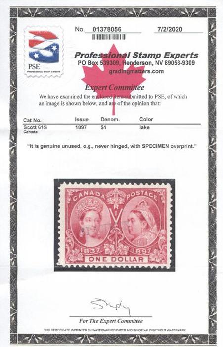 5386 61 image61, One Dollar Jubilee overprinted "SPECIMEN", bright fresh colour, nice centering, F-VF, NH. Has 2020 PSE Certificate (Image) (View Certificate)