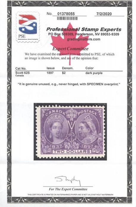 5393 62 image62, Two Dollar Jubilee with "SPECIMEN" overprint, fabulous rich colour, fresh, F-VF, NH. Has 2020 PSE Certificate. RARELY SEEN IN NH condition (Image) (View Certificate)