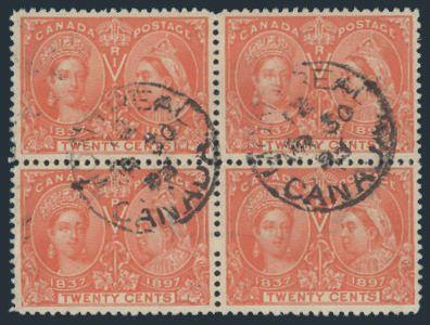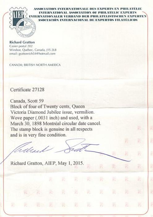 5380 59 image59, Scarce used block with perfect centering, lovely deep rich colour, neat Montreal 30 Mar, 1898 CDS cancels, XF. Has 2015 Gratton Certificate. THIS IS ONE OF THE FINEST USED BLOCKS OF THIS ISSUE KNOWN (Image) (View Certificate)
