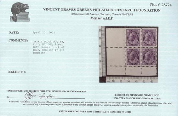 5421 68 image68, LL corner sheet margin block, lovely centering, fresh rich colour, XF, NH, trivial thin in selvedge margin only. Has 2021 Greene Foundation Certificate (Image) (View Certificate)