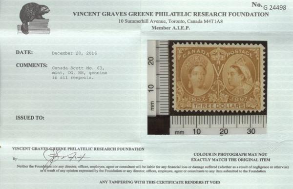 5402 63 image63, Three Dollar Jubilee, bright fresh colour, exceptionally fresh, F-VF, NH. Has 2016 Greene Foundation Certificate (Image) (View Certificate)