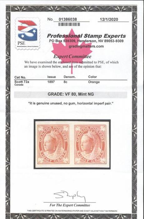 5438 72i image72i, Imperforate Pair, excellent margins, deep rich colour, VF, ungummed as issued. Has 2020 PSE Certificate (Image) (View Certificate)