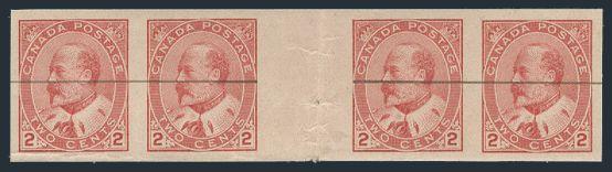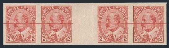5507 90Avi image90Avi, Imperforate horizontal GUTTER STRIP OF 4 with black lines, from the Experimental Printing. VF, NH, some creases (and small flt) in the gutter. VERY SCARCE & RARELY OFFERED ANYWHERE. Cat $3,750 (Image) Estimate 850.00+ $Cdn
