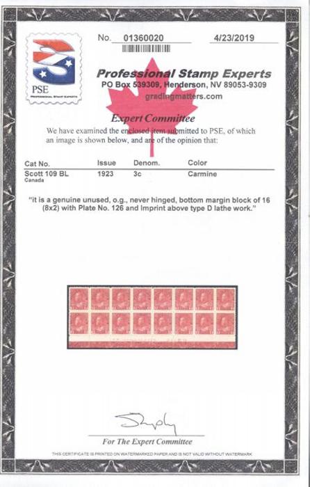 5566 109 image109, Spectacular looking bottom sheet margin LATHEWORK TYPE D block of 16 with full Imprint and Plate No. 126. Pristine fresh rich colour, lovely centering, VF, 13 stamps are NH. Has 2019 PSE Certificate. AN OUTSTANDING SHOWPIECE (Image) (View Certificate)