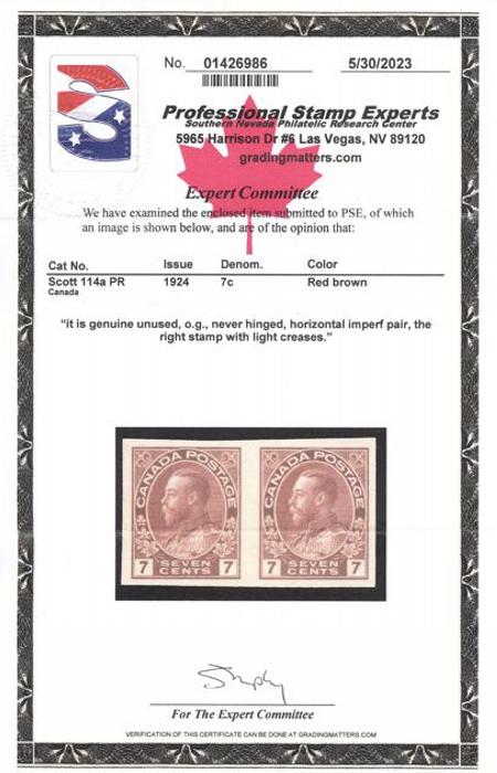 5581 114a image114a, Scarce IMPERFORATE PAIR, bright fresh colour, large balanced margins, VF, NH, right stamp with light creases. Has 2023 PSE Certificate. A RARE PAIR - Only 50 pairs exist (Image) (View Certificate)