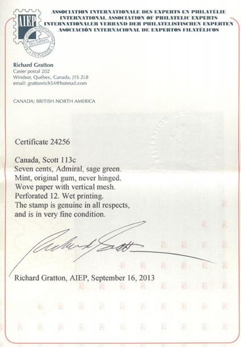 5577 113c image113c, Gorgeous & scarce SAGE GREEN shade of 7¢ KGV Admiral. VF, NH. Has 2013 Richard Gratton Certificate (Image) (View Certificate)
