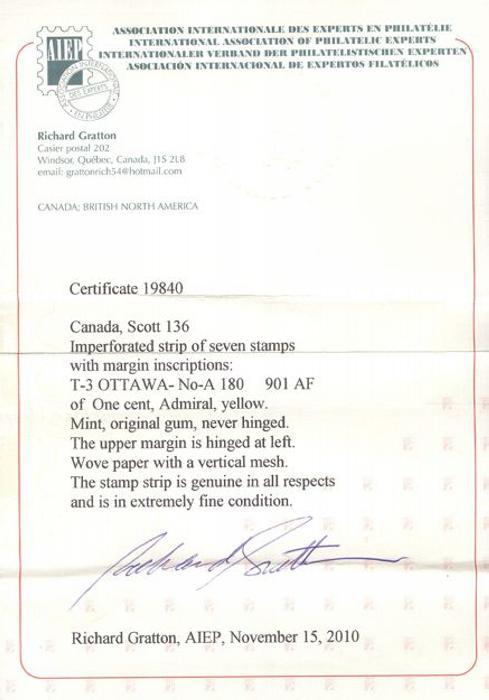 5623 136 image136, Pretty top marginal strip of 7 with full PLATE #180 IMPRINT & INSCRIPTIONS. XF, stamps are NH. Has 2010 Gratton Certificate (Image) (View Certificate)
