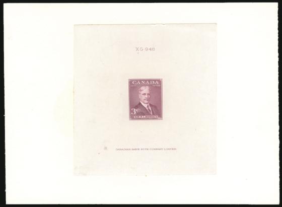 5850 303P image303P, Rare Trial Colour Die Proof of the 3¢ Borden in rose violet on glazed surface paper (72x75mm). Has Die "XF-948" number & plate imprint. Affixed on larger archival card. VF (Image) Estimate 450.00+ $Cdn