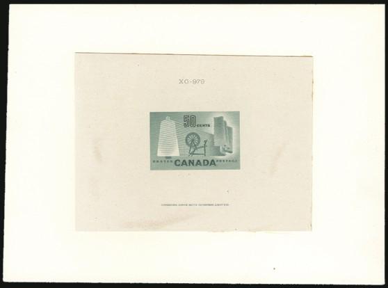 5851 334 image334, Large DIE PROOF of the 50¢ Textile on India (87mm x 64mm) mounted on large card. In colour of issue from the hardened state with full CANADIAN BANK NOTE Co. Ltd. imprint and Die #XG-979. VF. Very scarce and rarely ever offered (Image) Estimate 900.00+ $Cdn