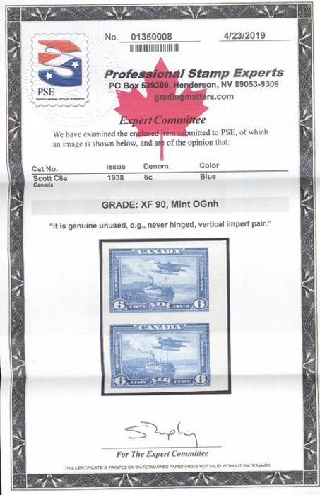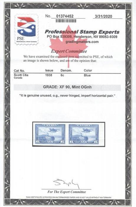 6016 C6a imageC6a, Sheet margin IMPERFORATE PAIR, large margins, crisp fresh colour, XF, NH. Only 75 pairs exist and this is one of the finest. Has 2020 PSE Certificate graded XF 90 (Image) (View Certificate)
