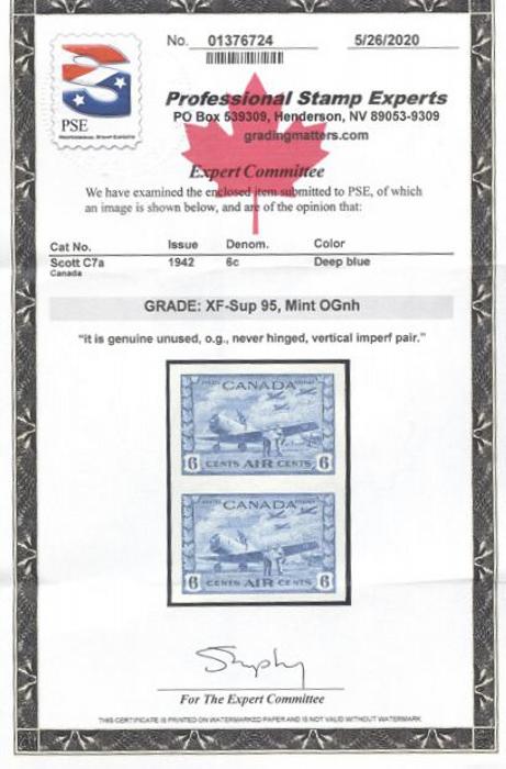 6017 C7a imageC7a, Imperforate pair, large balanced margins, post office fresh colour, XF, NH. Has 2020 PSE Certificate graded XF-Sup 95. VERY SCARCE AND UNDERPRICED - Only 50 pairs exist (Image) (View Certificate)