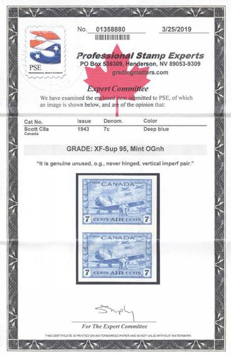 6019 C8a imageC8a, Imperforate pair, large margins, bright fresh colour, XF, NH. Has 2019 PSE Certificate graded XF-Sup 95. Only 50 pairs exist and this one is certainly one of the best. Underpriced in the catalogue (Image) (View Certificate)