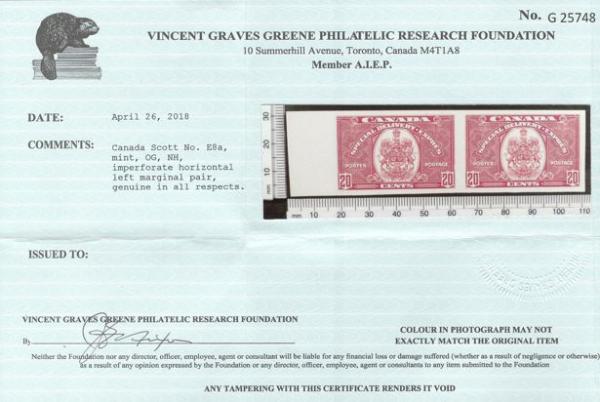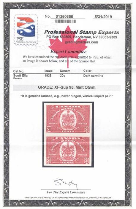 6046 E8a imageE8a, Gorgeous Imperforate Pair, large margins, pristine fresh colour, XF, NH. Only 75 pairs exist. Has 2019 PSE Certificate graded XF-Sup 95 (Image) (View Certificate)