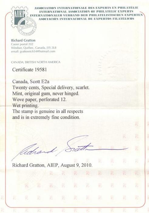 6031 E2a imageE2a, The 20¢ Scarlet, wet printing, exceptional centering, vibrant colour on fresh paper, XF, NH. Has 2010 Gratton Certificate. VERY DIFFICULT TO FIND IN THIS CHOICE QUALITY (Image) (View Certificate)