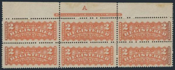 6050 F1 imageF1, Top margin Plate "A" Imprint block of 6, nicely centered, fresh colour (some slight oxidization at edges). VF, NH, some perf separation in selvedge. A RARELY SEEN PLATE BLOCK (Image) Cat 2,700.00+