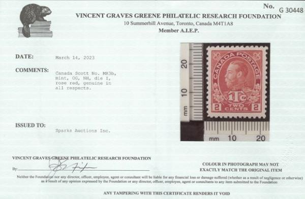 6083 MR3b imageMR3b, Rose Red Die I War Tax, choice centering, wide margins, pristine fresh colour, XF GEM, NH. Ex Athena, Ryterband. Has 2023 Greene Foundation Certificate (Image) (View Certificate)