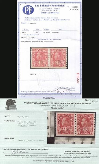 6090 MR6 imageMR6, War Tax coil pair, outstanding centering, wide margins, pristine fresh colour, XF GEM, NH. Ex Dr Killien, Lanza. Has 2018 Philatelic Foundation Certificate & 2023 Greene Foundation Certificate. RARELY SEEN IN THIS TOP CONDITION (Image) (View Certificate)