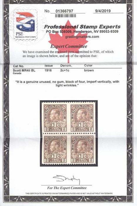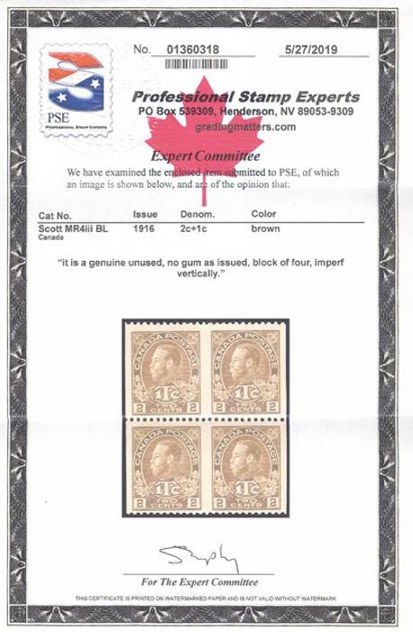 6088 MR4iii imageMR4iii, Block IMPERFORATE VERTICALLY, nicely centered, fresh rich colour, VF. Has 2019 PSE Certificate. VERY FEW BLOCKS EXIST (Image) (View Certificate)