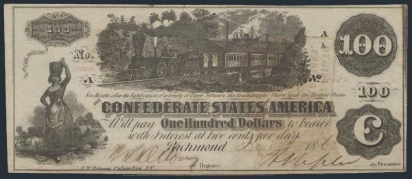 CONFEDERATE STATES $100 BILL: Confederate States of America $100 paper money note dated Richmond 20 June, 1862, hand signed, with h/s's on reverse. Has nice design depicting a Railroad, Steamship, etc. VF (Image)