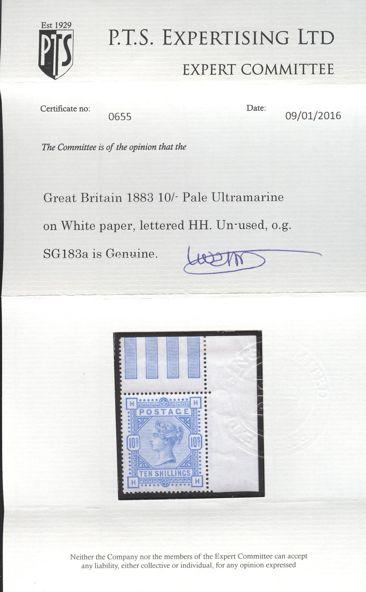 1012 109 image109, QV 10 Shilling pale ultramarine, perfectly centered with wide margins, bright fresh paper, XF, NH. Has 2016 PTS Certificate (corner selvedge subsequently removed). Ex Eubanks, Ryterband. RARELY EVER OFFERED IN NEVER HINGED CONDITION (Image) (View Certificate)