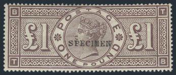 1015 110 image110, Rare mint QV One Pound with black "SPECIMEN" overprint (Type 9), fresh rich colour, nice centering, F-VF, LH (Normal stamp Cat $32,500 US) (Image) Estimate 2,000.00+ $Cdn