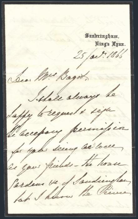 1108   imageThree-page signed letter headlined "SANDRINGHAM, KING'S LYNN" dated 25 Oct, 1866. Written and signed by SIR WILLIAM THOMAS KNOLLYS (1797-1883), British Major-General who reached high offices in the 1860's. He was Treasurer & Comptroller of the Household of the Prince of Wales (later KE), Lt. Gov. of Guernsey, etc. This letter is to Mrs Bagot regarding a visit to Sandringham. On mourning stationery. A nice historical item. F (Image) Estimate 150.00+ $Cdn