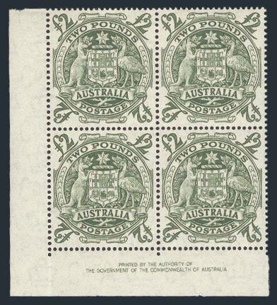 1366 218-21 image218-21, Set of Arms High Values from 5 Shilling to £2 all in matching LL corner imprint blocks. Fresh colours, VF, 5Sh one stamp LH, £2 has 2 stamps LH, otherwise rest are NH (Image) Cat 1,014.00