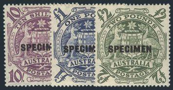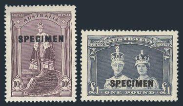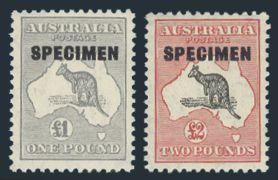 1353 128-9 image128-9, Kangaroo £1 and £2 High Values with 'SPECIMEN' overprints, fresh, VF, NH (Normal stamps Cat $4,700) (Image) Estimate 200.00+ $Cdn