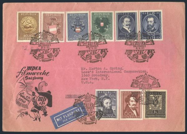 1403 561-2, 569-70, 572, B264- image561-2, 569-70, 572, B264-7, Tied by special Salzburg Film Festival on matching cach large size airmail cover to USA. F, light centre crease not affecting stamps. A GORGEOUS LOOKING COVER! (Image) Estimate 75.00+ $Cdn