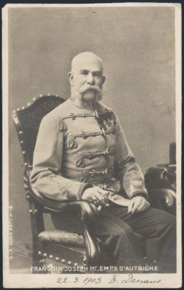 1438   imagePostcard with b/w portrait of EMPEROR FRANZ JOSEF used in France 1903. F (Image) Estimate 50.00+ $Cdn